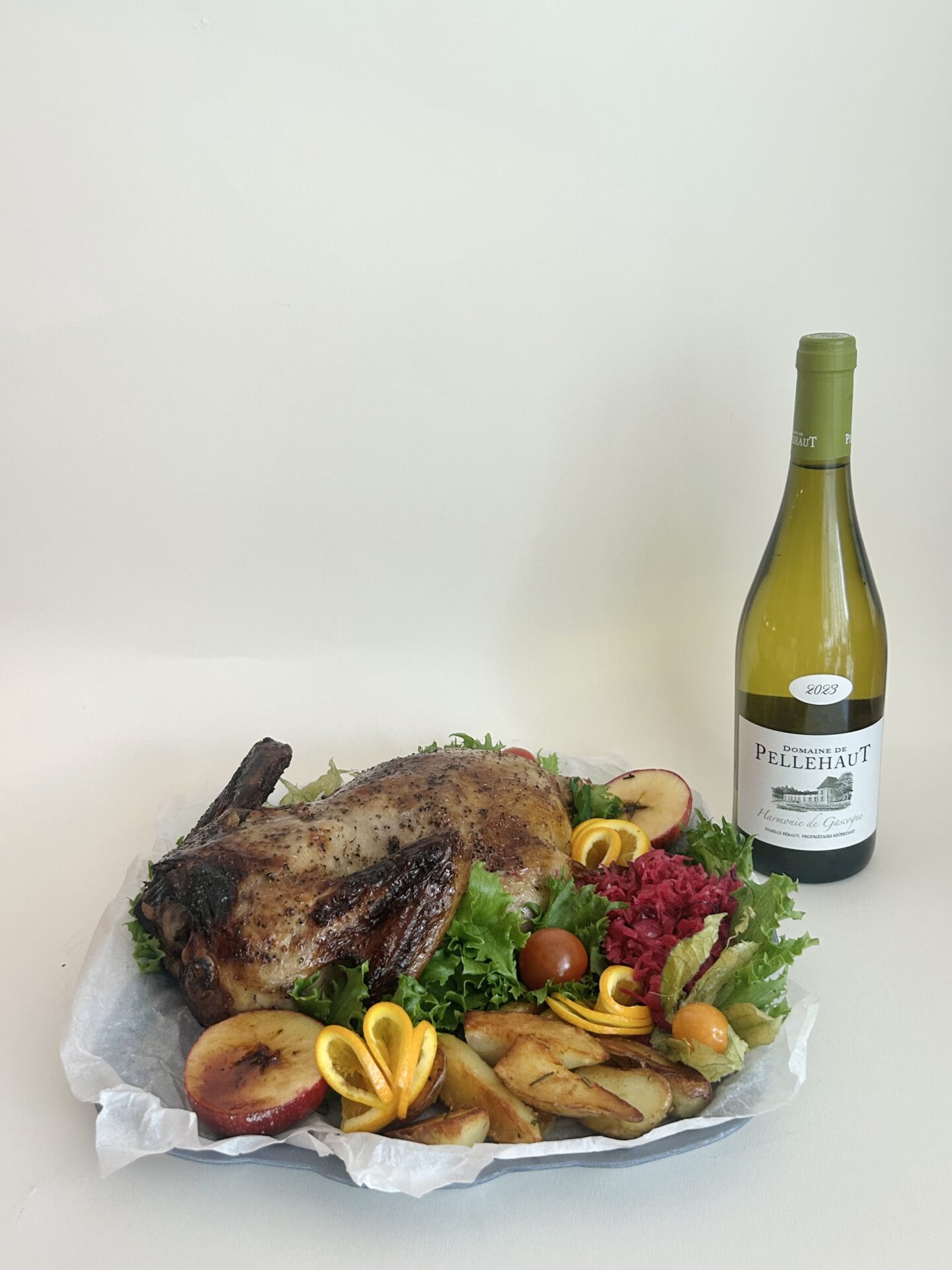 Фаршированная утка с корицей и яблоками, подаётся с жареным картофелем и красной капустой.